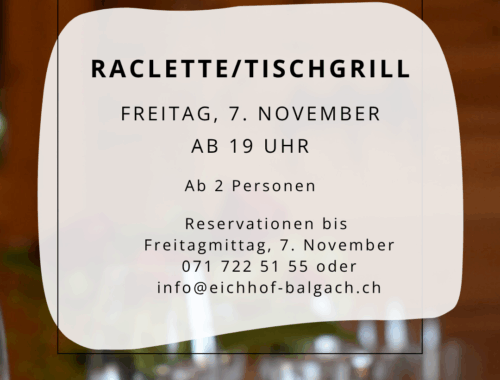Für Kurzentschlossene (ab 2 Personen) bieten wir am 7. November ab 19 Uhr Raclette an.